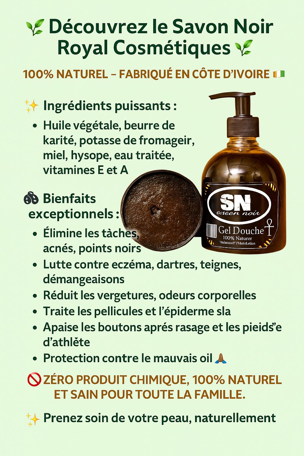 Nous sommes convaincus que vous allez aimer notre Savon Noir ! Commandez-le aujourd'hui et découvrez les bienfaits d'un produit naturel et traditionnel pour votre peau.