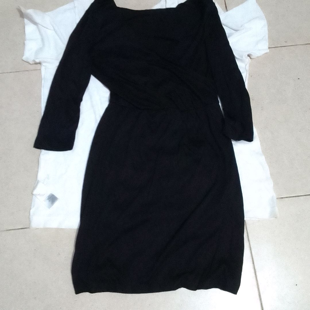 Robe courte noire friperie décolleté au niveau de la poitrine , arrive aux genoux , cette robe peut aller avec une femme qui a un peu de poitrine, ça tire disponible pour taille S ou M ,paiement à la livraison