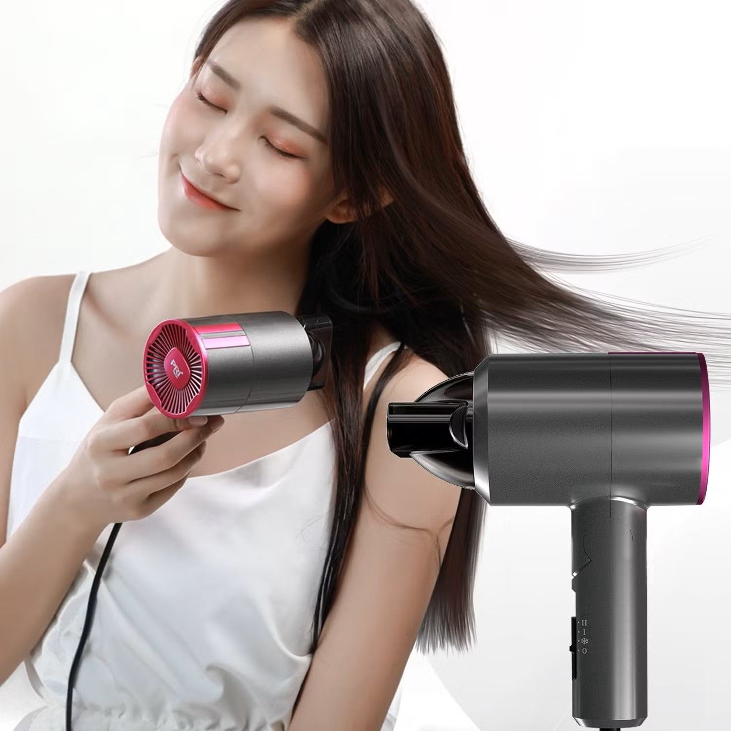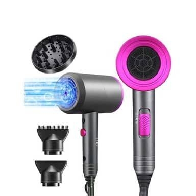 Design : Le sèche-cheveux illustré a un design moderne et compact, avec des accents roses vifs sur le corps gris foncé.
