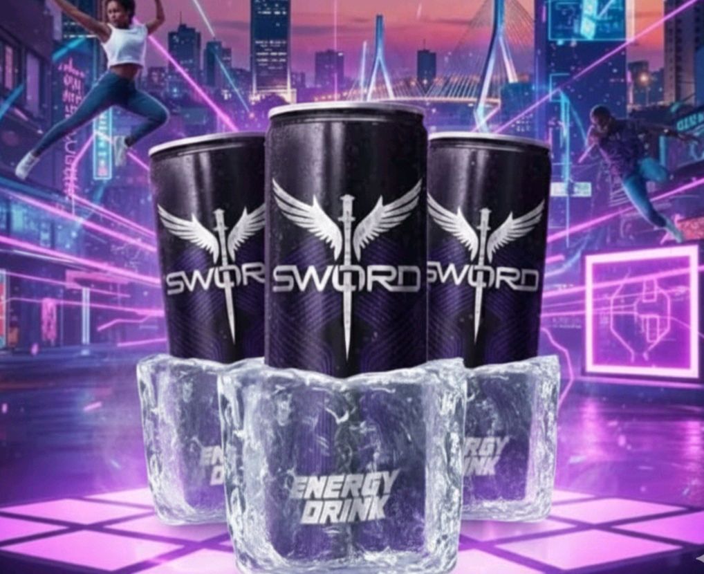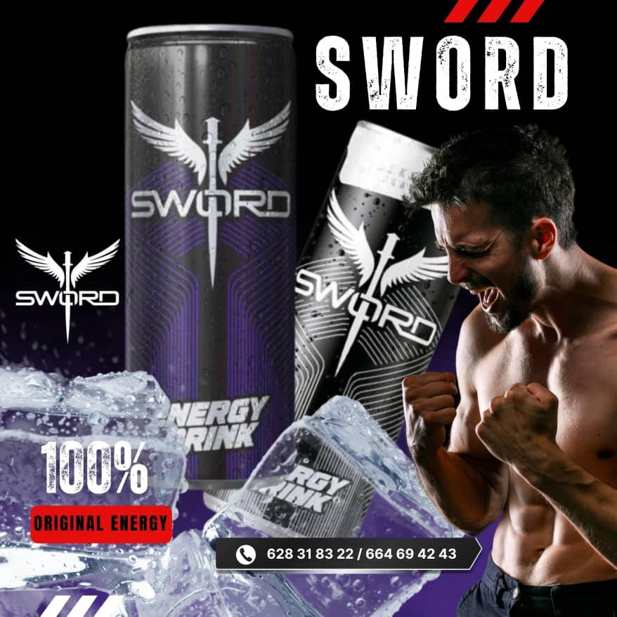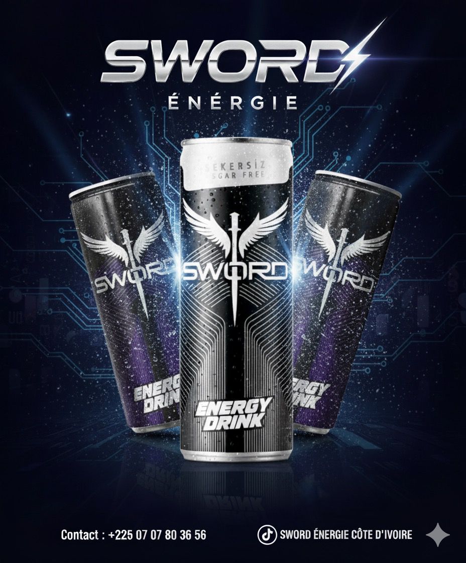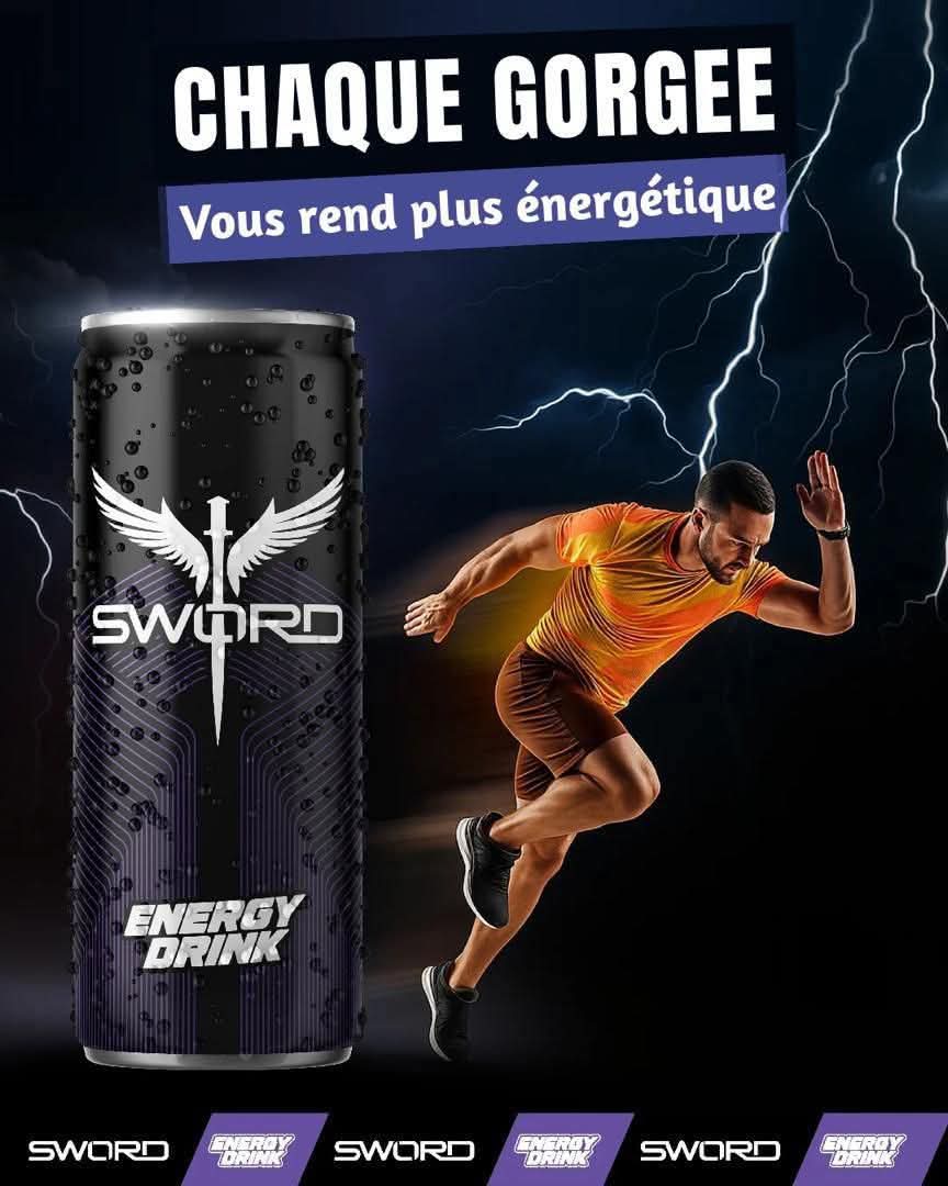 promotion de la boisson énergisante "SWORD". Le visuel met en avant trois canettes au design sombre (noir et violet) arborant un logo distinctif composé d'une épée ailée.« Réveillez la force qui est en vous. Libérez votre énergie avec SWORD. »9000fcfa le carton
